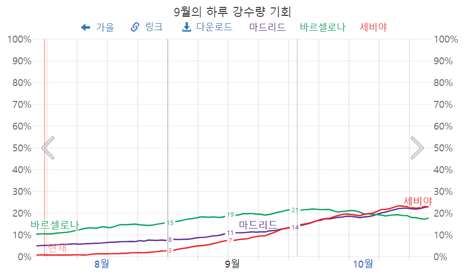 마드리드의 9월 강수량은, 8 ~ 14%로써, 비 올 확률이 매우 낮다는 것을 알 수 있습니다.