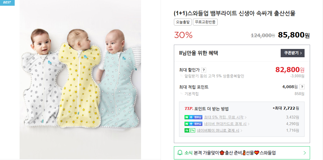 스와들업 : 아기가 잠을 잘 때, 모로반사를 하여 순간적으로 잠에서 깨는 경우가 많은데요, 이를 예방하기 위해 스와들업 선물도 좋습니다.