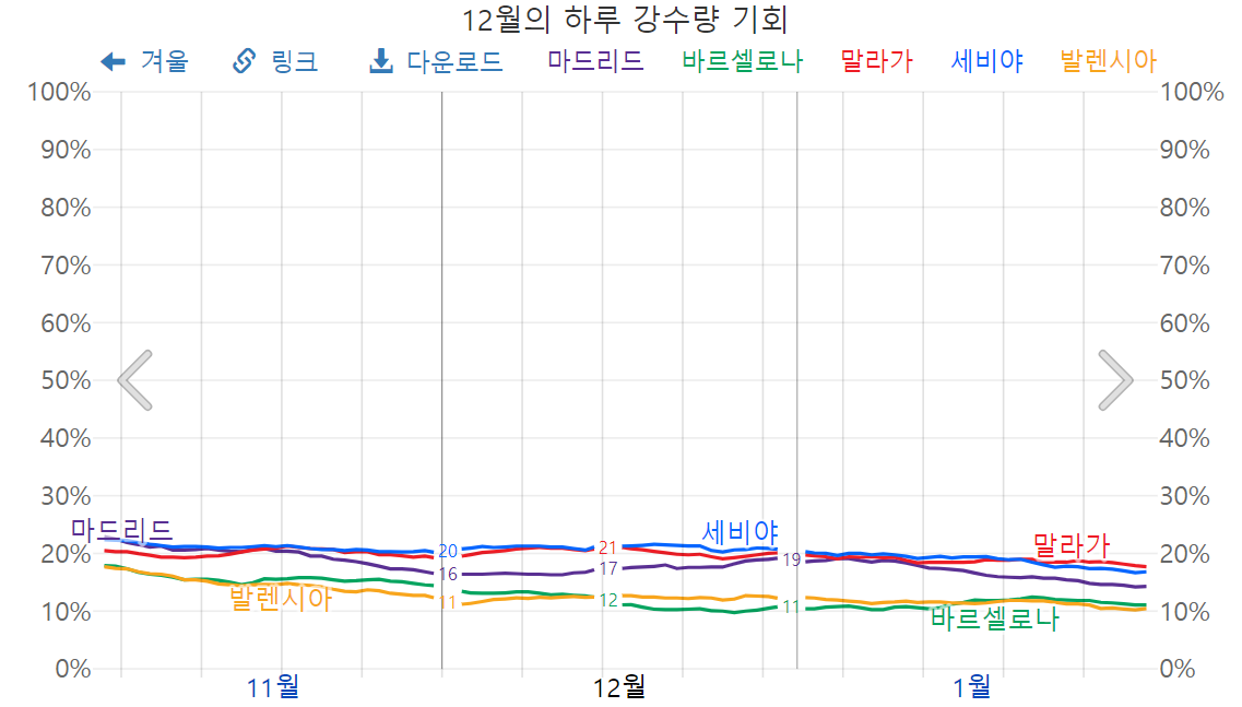 12월 스페인의 강수량은, 최저 11%, 최고 20%로써, 그리 비가 많이 내리지는 않는데요, 순서대로 세비야, 말라가, 마드리드, 바르셀로나, 발렌시아 순으로 강수량이 높겠습니다.