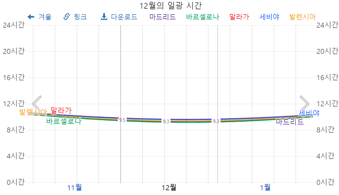 스페인의 12월은 해가 9.3 ~ 9.5시간 정도 떠 있으므로, 금방 어두운 밤이 찾아온다는 것을 알 수 있습니다.